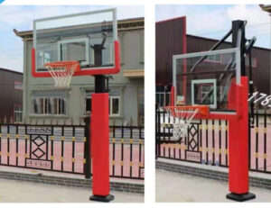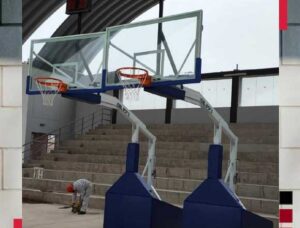 - Castillo de basquet fijo profesional: diseñado para canchas permanentes, con estructura de acero galvanizado y base de concreto. Es resistente al viento y al uso intenso.