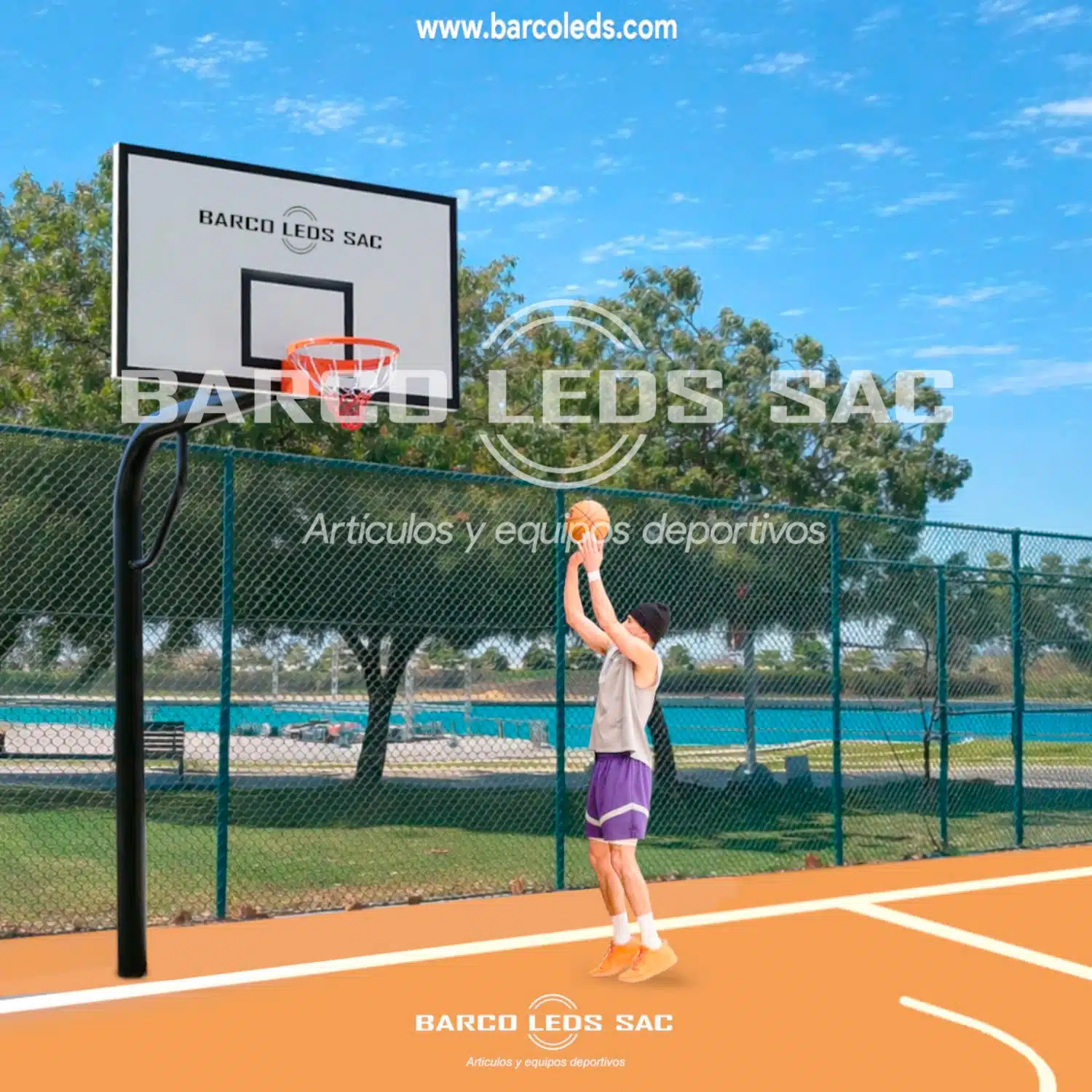 De 180m x 105m x 10 mm espesor – medidas oficiales FIBA, montado en un marco metálico y aluminio, con protectores de seguridad.
